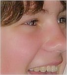 Bilden är tagen med Sony Mavica MVC-FD88, inomhus och med kamerans blixt. Jag har klippt ut en detalj ur bilden, men för övrigt har jag använt den precis som den är. Ögon och hår är oskarpa och flickans kind är "tonårsprickig" (tycker hon själv).