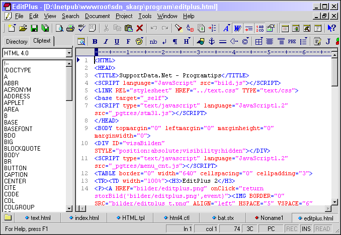 Programmet kan testas under 30 dagar. Därefter måste du antingen avinstallera eller betala det. När du startar programmet får du information om hur mycket som återstår av de 30 provdagarna. När du har betalat för programmet, fått registreringsuppgifter via e-post och matat in dessa, visas inte denna information längre. När programmet startats möts du av ett fönster uppdelat i tre ytor. Överst finns i vanlig ordning menyer och knappar för olika snabbval. Beroende på vad du arbetar med, ändras också snabbvalsknapparna. Knappar, ja. På mitt tangentbord har jag tangenter för olika snabbval såsom spara, öppna, stäng, skriv ut, hjälp med flera. Med undantag för hjälp fungerar inte dessa snabbtangenter i EditPlus. Däremot går det utmärkt att använda Windows vanliga snabbkommandon såsom CTRL+S för att spara, CTRL+P för att skriva ut och Ctrl+C för att kopiera. Under menyer och snabbvalsknappar finns ett smalt fönster till vänster, Cliptext Window, som innehåller olika "cliptexter" för snabb och enkel åtkomst. Dessa cliptexter kan med ett dubbelklick infogas i det aktiva dokumentet. Det går även att redigera befintliga klipp eller skapa egna klippbibliotek. Detta är mycket användbart och kan förenkla och snabba upp arbetet väsentligt. FärgkodningTill höger finns själva huvudfönstret. Här skrivs och redigeras all text och den automatiska färgkodningen fungerar för HTML, CSS, PHP, ASP, Perl, C/C++, Java, JavaScript och VBScript. På programmets hemsida finns bilder som visar exempel på detta. Färgkodningen fungerar även när du klistrar in textblock som kopierats från annat håll. Till skillnad från många liknande program får du färgkodad text även vid utskrift. Jag tycker att denna färgkodning är en stor fördel. Du måste naturligtvis skriva ut på en färgskrivare om du vill ha utskriften färgkodad.