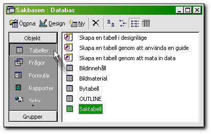 Bilder i Accessav Detta är en metod att knyta bilder till de olika posterna i en MS Access-databas utan att basen växer ohämmat, vilket sker om bilderna länkas enligt metoderna i Access' hjälpavdelning. Metoden har framtagits för och tillämpats på föremålen hos några hembygdsföreningar, men kan givetvis användas i många andra sammanhang. Access 2000 har använts för exempelbilderna. Handledningen förutsätter att du har åtminstone grundläggande erfarenhet av Access ÖversiktAccess är ett mycket kompetent databasprogram, väl värt en närmare bekantskap. Det ingår i MS Office Professional. Man kan göra allt från enkla register med en enda tabell till mer komplicerade databaser med många tabeller som på olika sätt är knutna till varandra. Exempel på det första, ofta kallat en platt databas, är en vanlig förteckning, där man antecknar olika egenskaper för föremål. Exempel på den andra kategorin är när ett företag, som säljer ett antal produkter, utöver en tabell för produkterna kan tänkas vilja ha en anknuten tabell för leverantörerna och en tredje för kunderna. Var och en av dessa tabeller kan sedan vara förgrenad till tabeller för kontaktpersoner, fakturor, betalningar med mera. Databasens tre delarEn databas består alltså i grunden av en eller flera tabeller som utgör behållare för informationen. Vidare finns ett eller flera så kallade formulär för att underlätta inmatning av nya data och för att visa en överblick av data för ett visst område. Slutligen finns rapporter för skärmvisning eller utskrift av önskade delar.