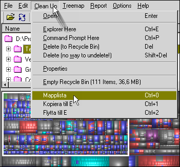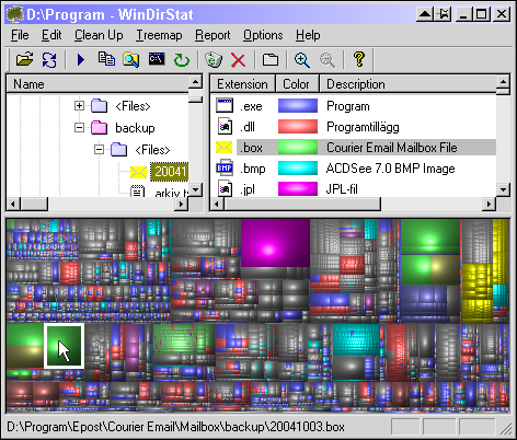 Två versioner – välj rätt version för ditt operativsystem Windows 95, 98 och ME: WinDirStat 1.1.1 Executables (Ansi) (635 KB) Starta programmet och välj vad du vill titta på: alla enheter, enstaka enheter eller enstaka mappar. Alla filer finns tillgängliga, ned till minsta lilla skruttfil, via utforskarträdet "Directory List", filtypslistan "Extension List" och den grafiska presentationen "Treemap". Treemap