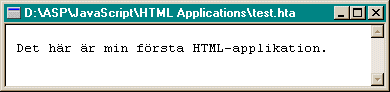 Använd din vanliga texteditor och skriv: Det här är min första HTML-applikation. Spara texten som test.hta och öppna filen från Utforskaren.
