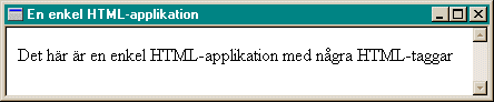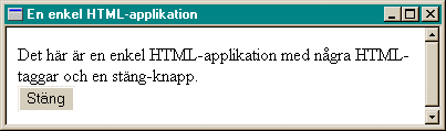 Testa exemplet - välj "Öppna den här filen från dess aktuella plats" i dialogrutan. Om du tidigare har skrivit HTML-kod känner du igen de flesta taggarna, men "<HTA:APPLICATION>" är något nytt. Den här taggen talar om att det handlar om en HTA-sida. Den kan placeras var som helst i HTML-dokumentet, med rekommendationen är att den läggs i HEAD-blocket. Att använda <HTA:APPLICATION> utan att lägga till några attribut, är detsamma som att utesluta <HTA:APPLICATION>. När du lägger till attributen bestämmer du vilket gränssnitt din applikation skall ha. Mer om detta i Anpassa din HTA. Fortfarande måste du använda kryssrutan för att stänga HTA-fönstret. Lägg in en knapp att stänga med. Det gör du genom att ändra koden en aning: <HTML> Spara filen och öppna den. Resultatet blir det här: