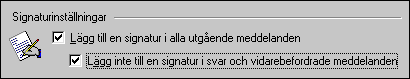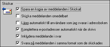 Spara en kopia ... Det är bra att lägga skickade meddelande i mappen "Skicka". Skulle du känna dig osäker på om ett brev är skickat, kan du kontrollera detta här. Skicka meddelanden ... Det är praktiskt att inte skicka brev omedelbart. Låter du bli att kryssa i det alternativet, lägger sig brevet först i mappen "Utkorgen" och skickas inte förrän du klickar på "Skicka och ta emot". Det händer ju att man, medan man skriver ytterligare ett brev, kommer på att något borde ändras i det föregående brevet. Klicka då bara på "Utkorgen", högerklicka på brevet och välj "Öppna". Ändra i brevet och skicka det sedan igen. Lägg automatiskt till ... Det kan vara klokt att ta bort markeringen här annars råkar du lätt ut för att adressboken växer till ett ohanterligt jätteformat. Om du har det här alternativet markerat, kommer Outlook Express dessutom att lägga till avsändaren precis som den är skriven i "Från", och du har ingen glädje av en rad avsändare av typen "js" eller "Egen". Lägg till nya kontakter själv i stället. Då kan du namnge avsändarna på ett begripligt sätt och sortera dem hanterbart. Komplettera e-postadresser ... Det här är en praktisk funktion. Finns adressen som du skriver in i adressboken, slipper du vanligen skriva hela adressen. Inkludera meddelande ... Med det här alternativet kommer originalbrevet att finnas med i svaret, och du kan själv avgöra vad som bör klippas bort. Svara på meddelanden ... Alternativet bör vara markerat. Det gör att avsändare som till exempel skickar brev oformaterade, kanske därför att de har modemuppkoppling, också får svar i det formatet. Fliken "Signaturer"